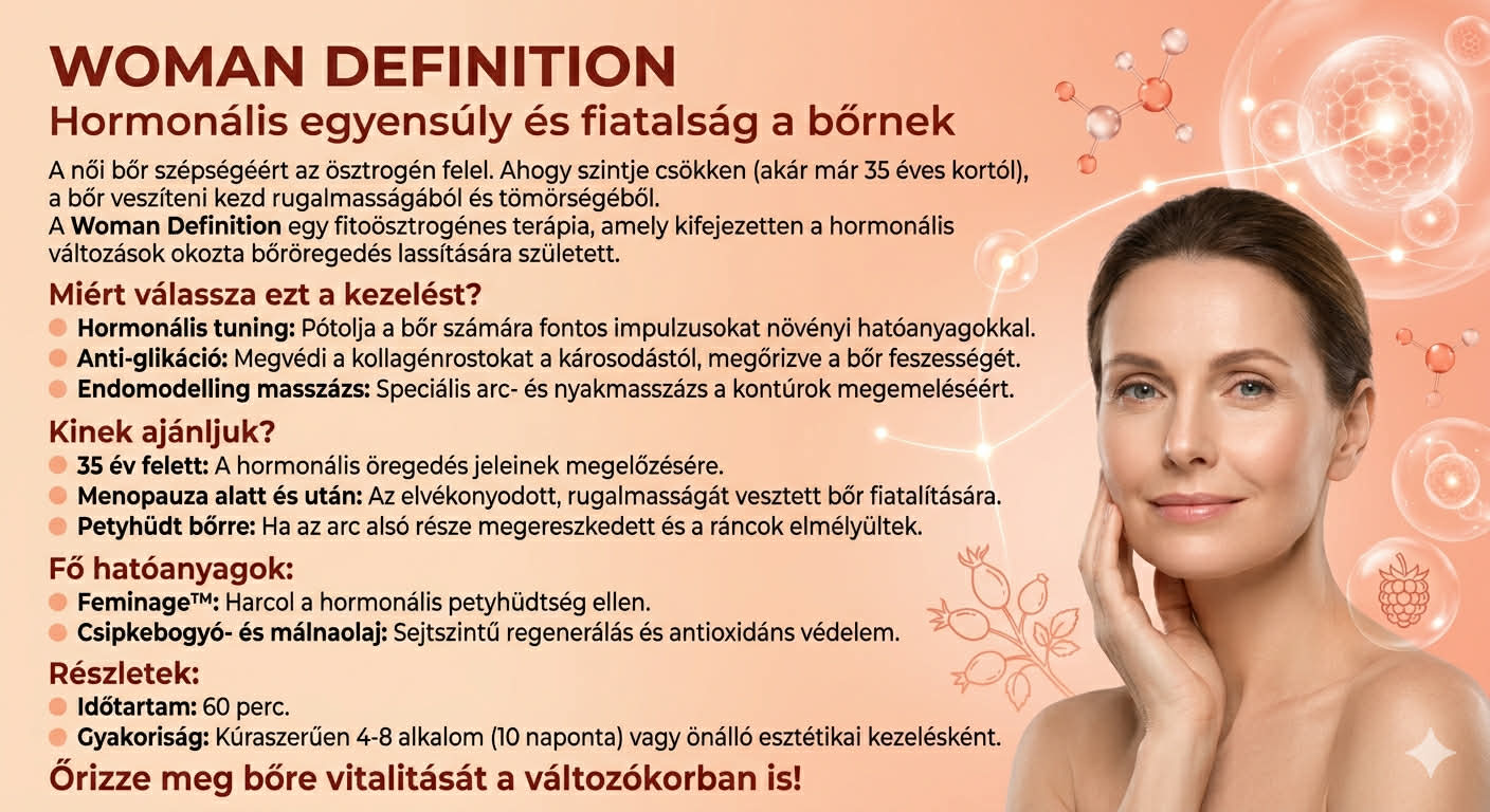 A Woman Definition egy speciális dermokozmetikai kezelés, amelyet kifejezetten a hormonális változások során fellépő bőröregedés lassítására fejlesztettek ki. Akár már a 30-as évek közepétől!